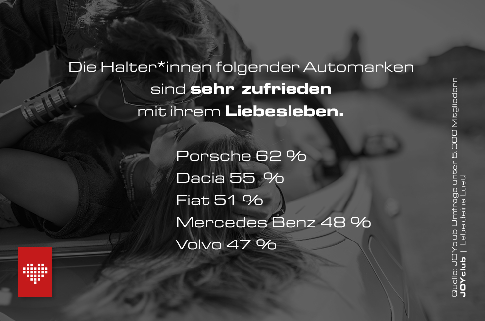 Knapp zwei Drittel aller Porsche-Fahrer*innen sind mit ihrem Sexleben glücklich oder sehr glücklich. Damit nehmen sie die Pole-Position im Sexappeal-Ranking der Automarken ein, welches die Erotik-Community JOYclub in einer Umfrage unter 5.000 Mitgliedern erstellt hat.