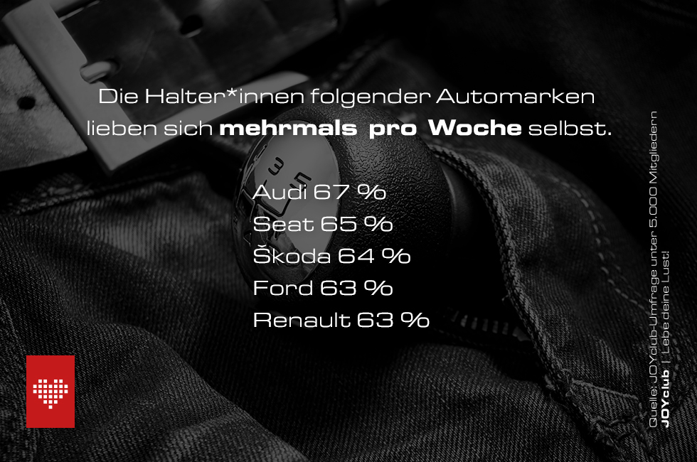 Gefragt nach der Masturbationshäufigkeit belegen die Kunden des VW-Konzerns durchweg Spitzenpositionen. 66,5 % der Audi-Fahrerinnen schalten täglich oder zumindest mehrmals wöchentlich manuell in den höchsten Gang. Auf den Plätzen folgen die weiteren VW-Töchter Seat (64,5 %) und Škoda (64,2 %). Am seltensten packen indes die Fahrerinnen von Dacia und Porsche ans eigene Steuer.