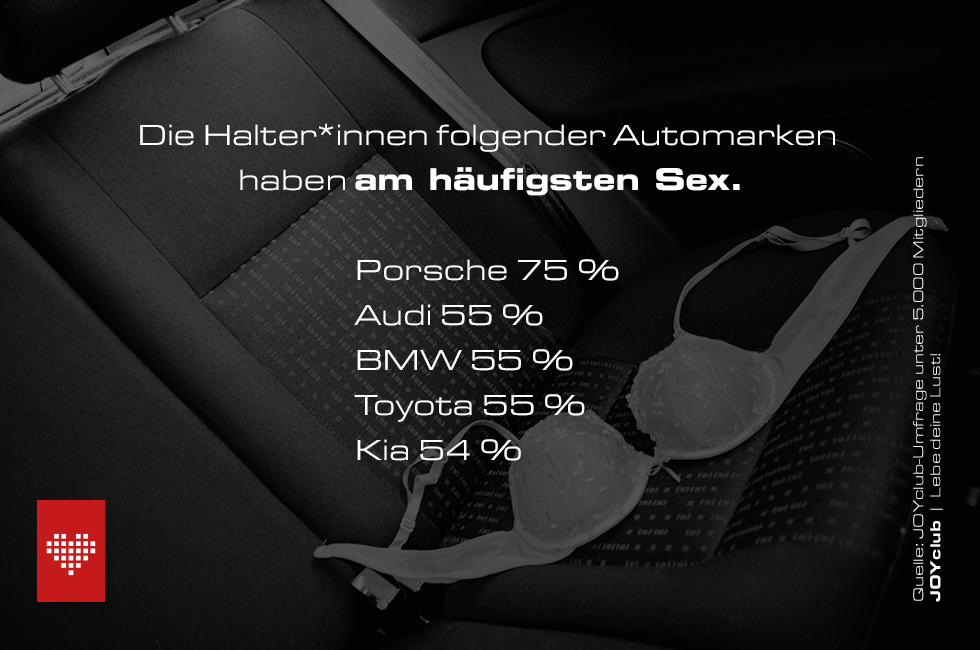 Am unglücklichsten mit ihrem Liebesleben zeigen sich indes Hyundai- und Opel-Fahrer*innen, deren Bedürfnisse oft auf der Strecke bleiben. Den Zusammenhang zwischen Automarke und sexueller Zufriedenheit untersuchte die Erotik-Community JOYclub erstmals im April 2018. Damals ging vor allem noch Seat- und Škoda-Fahrer*innen der sexuelle Sprit aus.
